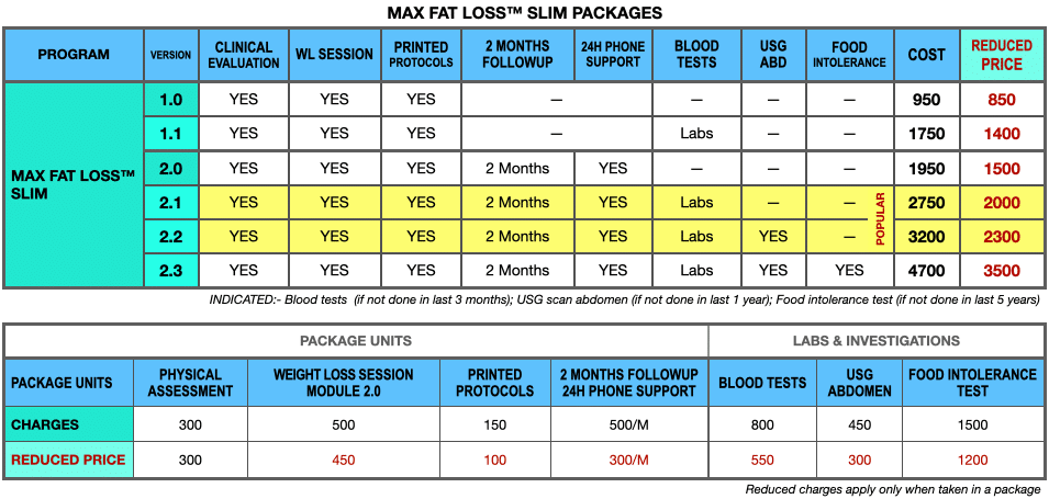 Depending on the package, the price includes - consultation, physical assessment, fat biometrics, essential labs, main weight loss session (diet & exercise plans, etc.), detailed instruction sheets and prescriptions with 2 months supervision (24h phone support and free visits). The prices have been reduced and kept fixed.