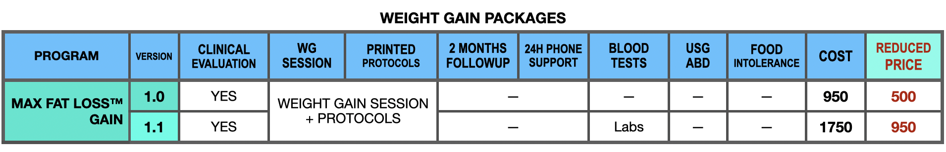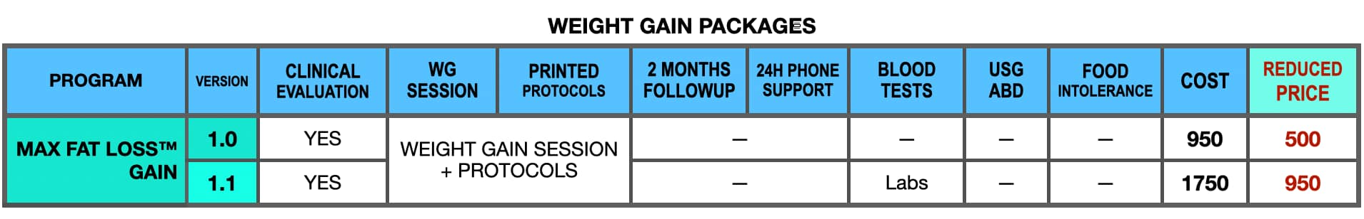 Weight gain package includes initial evaluation and assessment followed by treatment with a combination of diet, exercise, lifestyle changes, supplements and medications.